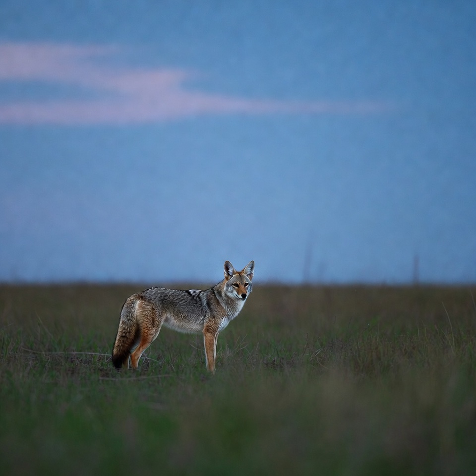 animal, blue sky, canine, clouds, dusk, ears perked, field, fur, grass, isolated background, mammal, nature, pink clouds, prairie, sky, standing, sunset, tail, wild animal, wildlife, coyote