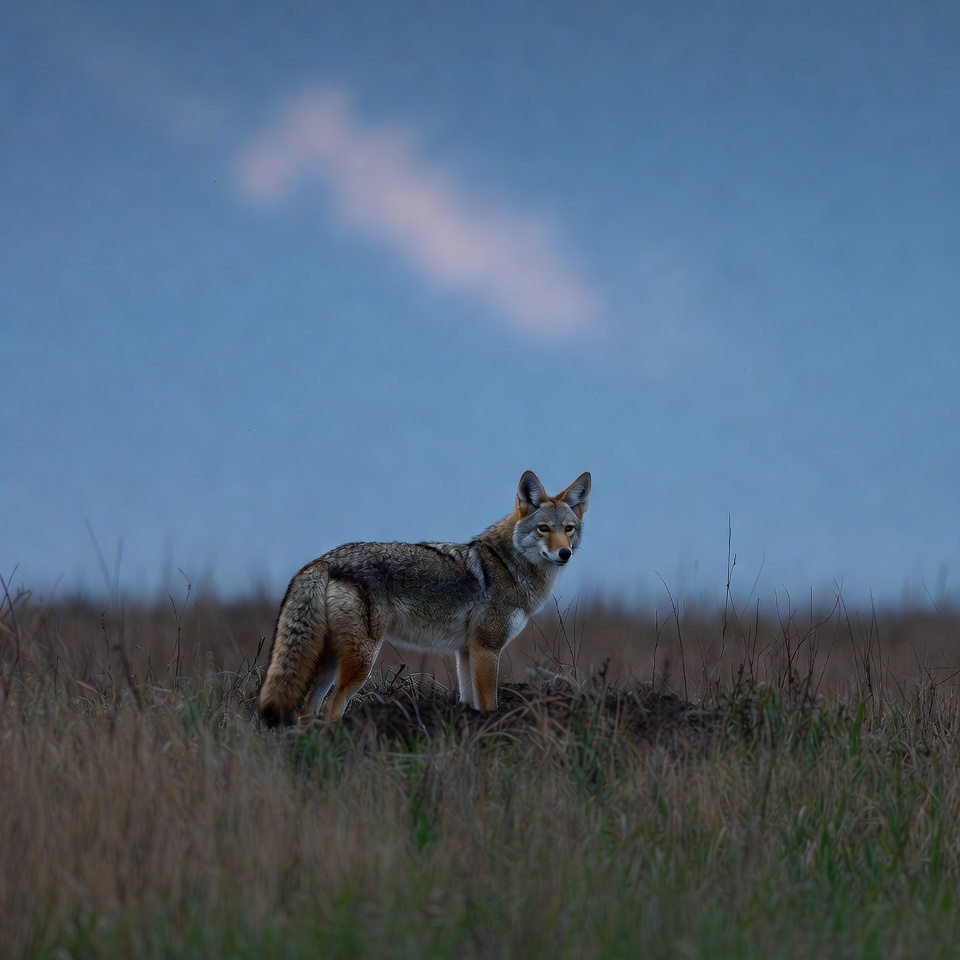 alert pose, animal portrait, blue sky, coyote standing, dirt mound, dusk, field, fox-like, grassy field, isolated background, nature, outdoors, pink cloud, pointed ears, reddish fur, tall grass, twilight sky, wild animal, wildlife, coyote