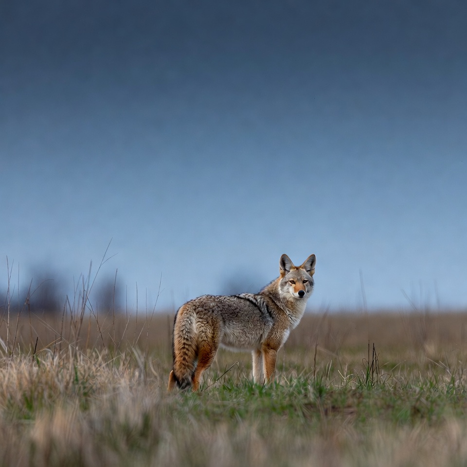 alert, animal, blue sky, bushy tail, cloudy sky, field, fur, grass, mammal, nature, outdoors, predator, reeds, standing, wild animal, wildlife, coyote