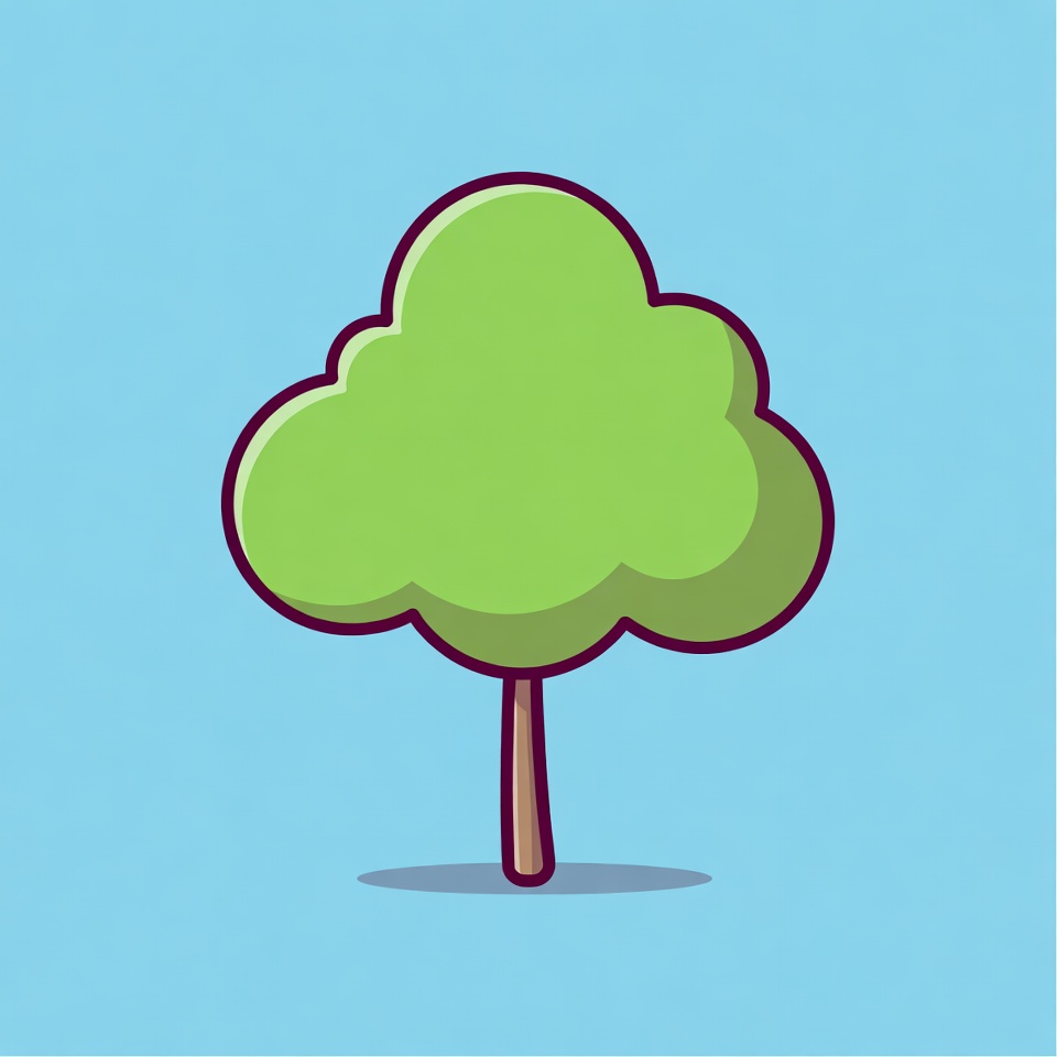 A simple cartoon illustration of a green tree with a brown trunk stands on a solid blue background. The tree has a puffy, cloud-like green canopy outlined in purple. It features a subtle shadow beneath for a floating effect.
