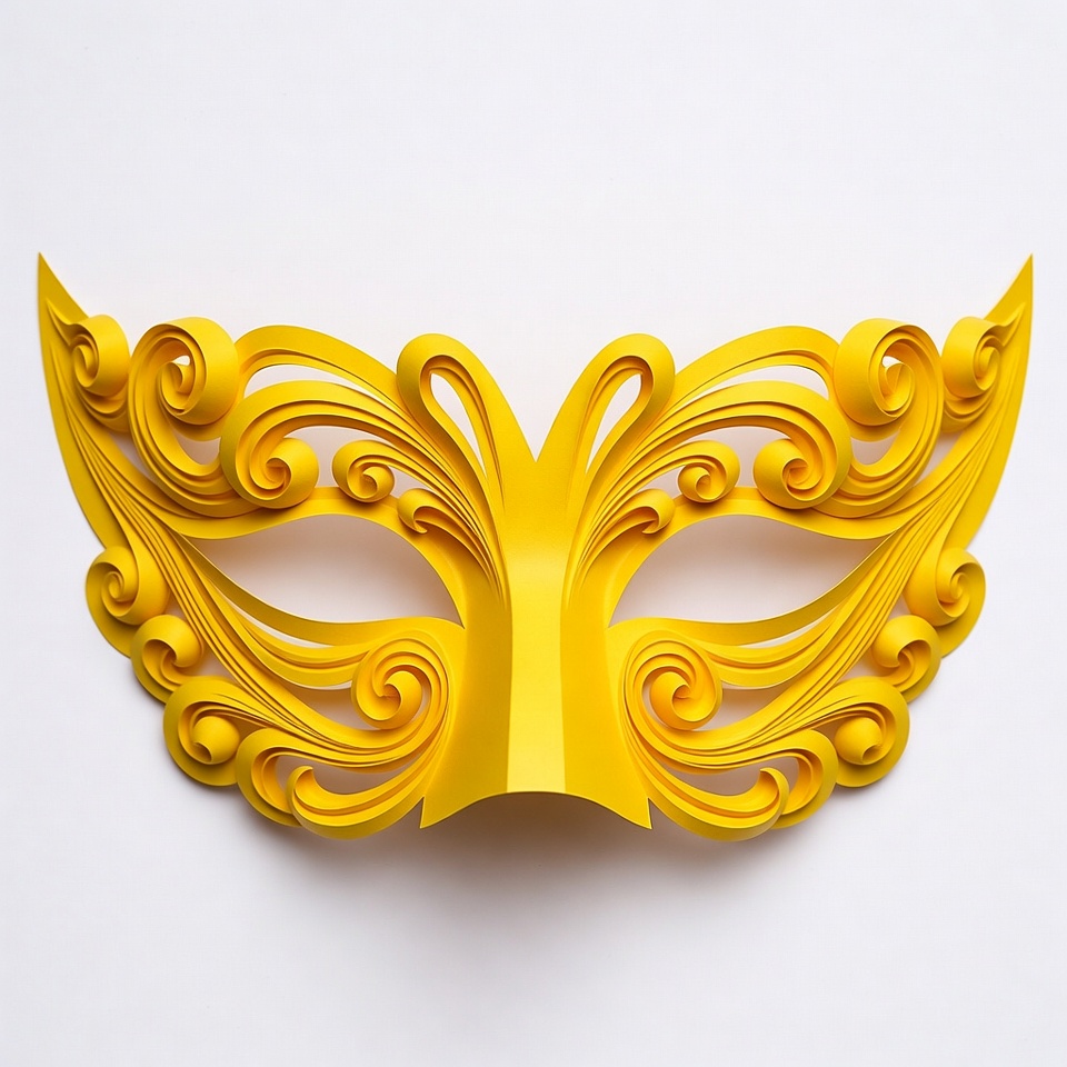carnival mask, costume accessory, craft mask, decorative mask, elegant mask, eye mask, fancy mask, festival mask, intricate design, isolated mask, layered paper, masquerade mask, ornate mask, paper craft, party mask, swirling patterns, venetian style, white background, yellow mask, gold mask