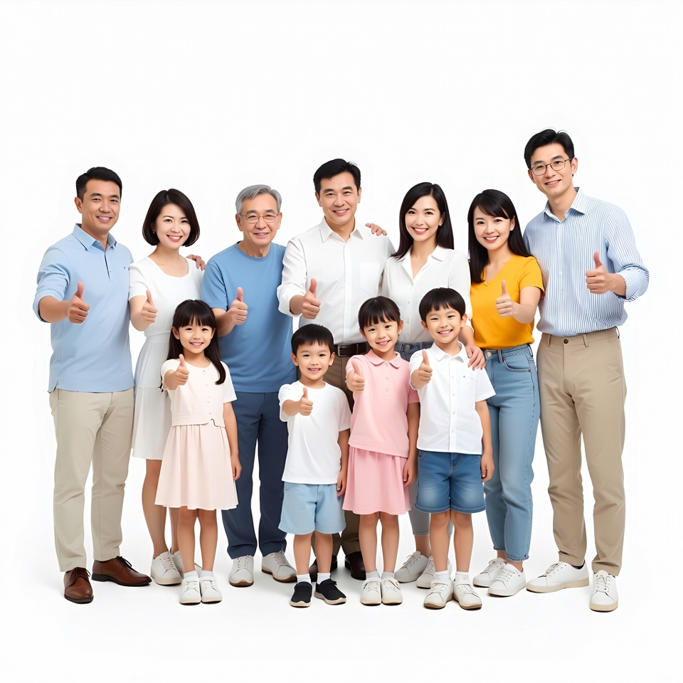 A large Asian family stands together on a white background, smiling and giving thumbs up gestures. The group includes grandparents, parents, and several young children dressed in casual clothes like shirts, dresses, and shorts. They are arranged in rows, posing cheerfully for the photo.