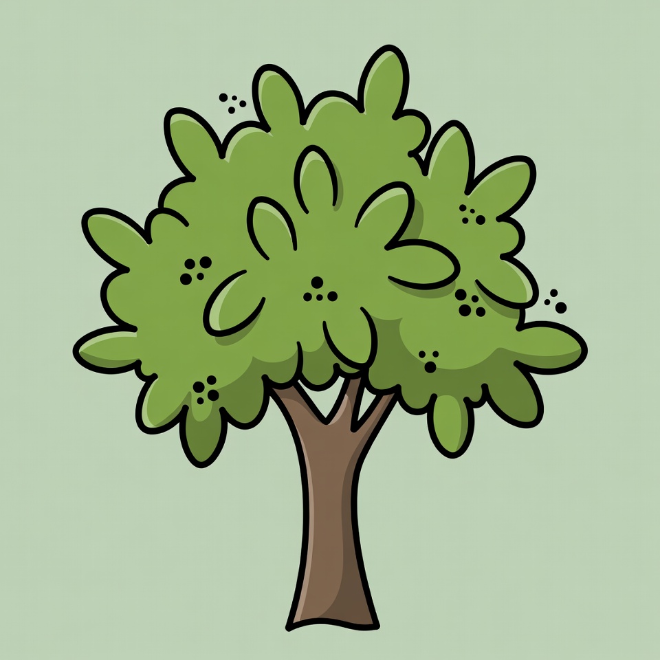 A vibrant cartoon tree with lush green leaves and small berries stands on a light green isolated background. The tree features a brown trunk and numerous outlined leaves with black dots. It is drawn in a simple, colorful clipart style.