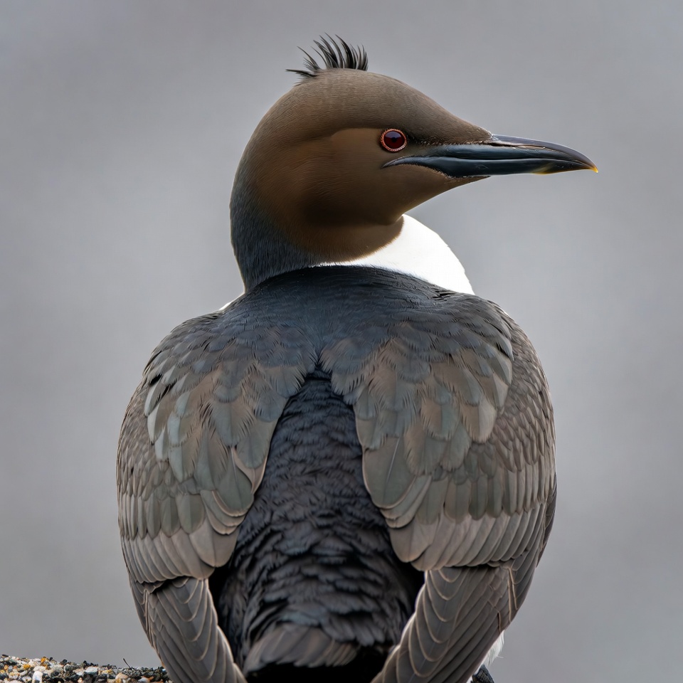 avian, bird, birdwatching, black beak, brown head, dark wings, feathers, gray feathers, loon, nature, profile view, red eyes, rocky perch, seabird, water bird, waterfowl, white belly, wildlife, red-throated loon