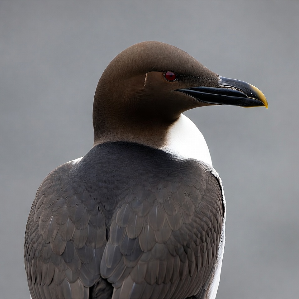 animal, avian, bird, black beak, brown guillemot, brown head, feathers, gray wings, isolated background, profile view, red eyes, sea bird, seabird, white underbelly, wildlife, guillemot