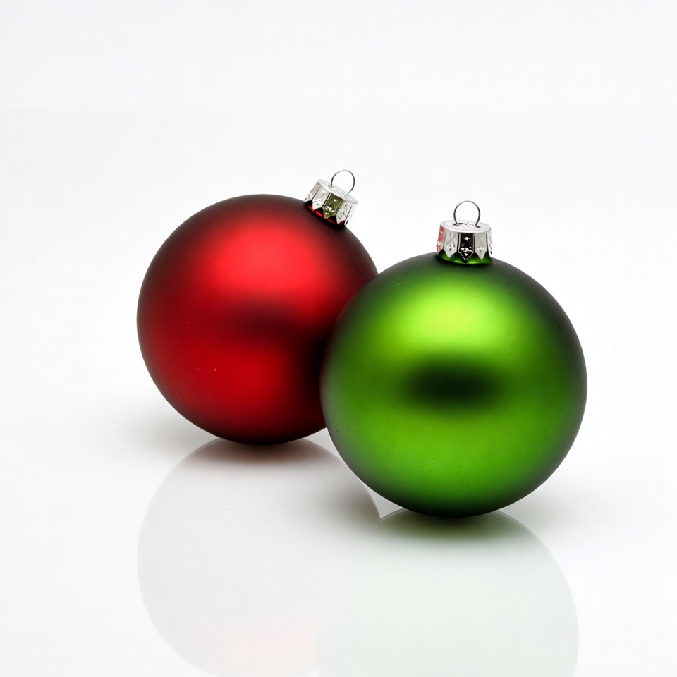 Two shiny Christmas baubles, one red and one green, hang from silver hooks against a white background. They are smooth and reflective with subtle shadows and highlights. The ornaments are positioned side by side, isolated for a clean look.