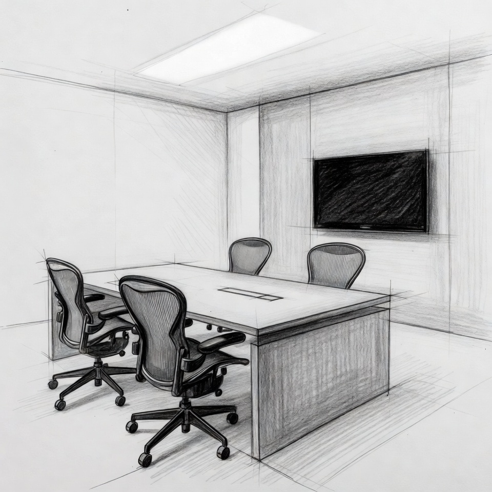 architecture sketch, business meeting, conference room, conference table, empty room, ergonomic chairs, flat screen TV, interior design, isolated background, modern office, no people, office, office chairs, sketch drawing, wall mounted TV, whiteboard sketch, meeting room