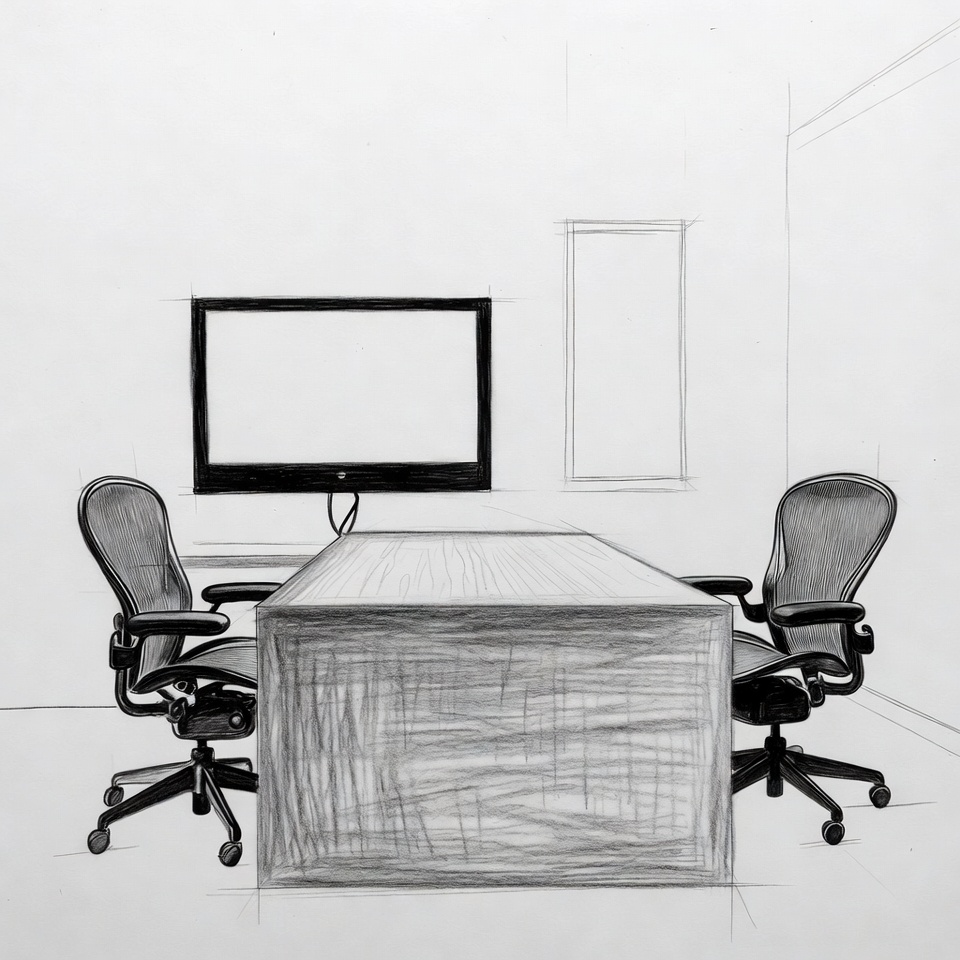 A sketch drawing depicts an empty conference room with a large wooden table at the center. Two black office chairs with armrests are positioned on opposite sides of the table. A blank wall-mounted TV screen and a window are visible on the wall behind.