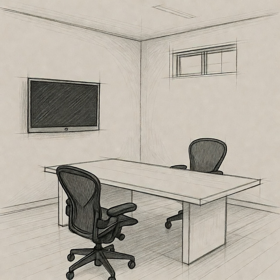 architecture sketch, business room, chairs, conference table, desk, empty office, ergonomic chairs, interior design, isolated background, meeting room, modern furniture, office chairs, office interior, pencil sketch, sketch drawing, television screen, wall TV, window, workspace, office room