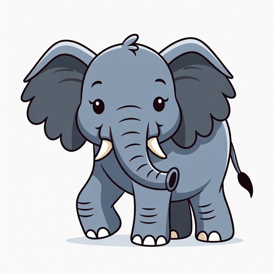 animal, baby elephant, big ears, cartoon elephant, chubby elephant, clipart, cute elephant, gray elephant, illustration, isolated background, large eyes, standing elephant, trunk, tusks, walking elephant, elephant