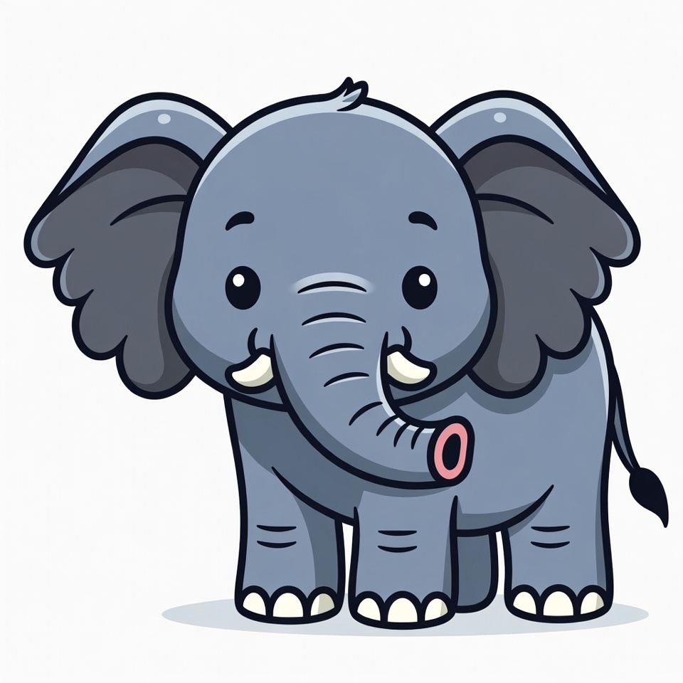 A cute cartoon illustration of a baby elephant with large ears, trunk, and tusks stands on white background. The elephant has big expressive eyes, gray body, pink inside the trunk, and a small tail. It is depicted in a playful, chibi style with white feet.