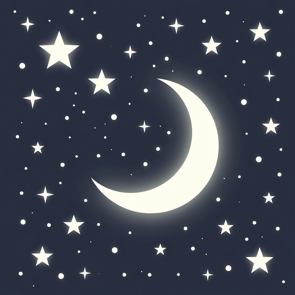 A vibrant illustration features a glowing white crescent moon centered against a deep navy blue background. Numerous white stars of varying sizes sparkle around the moon. The design uses simple cutout-style graphics on an isolated background.