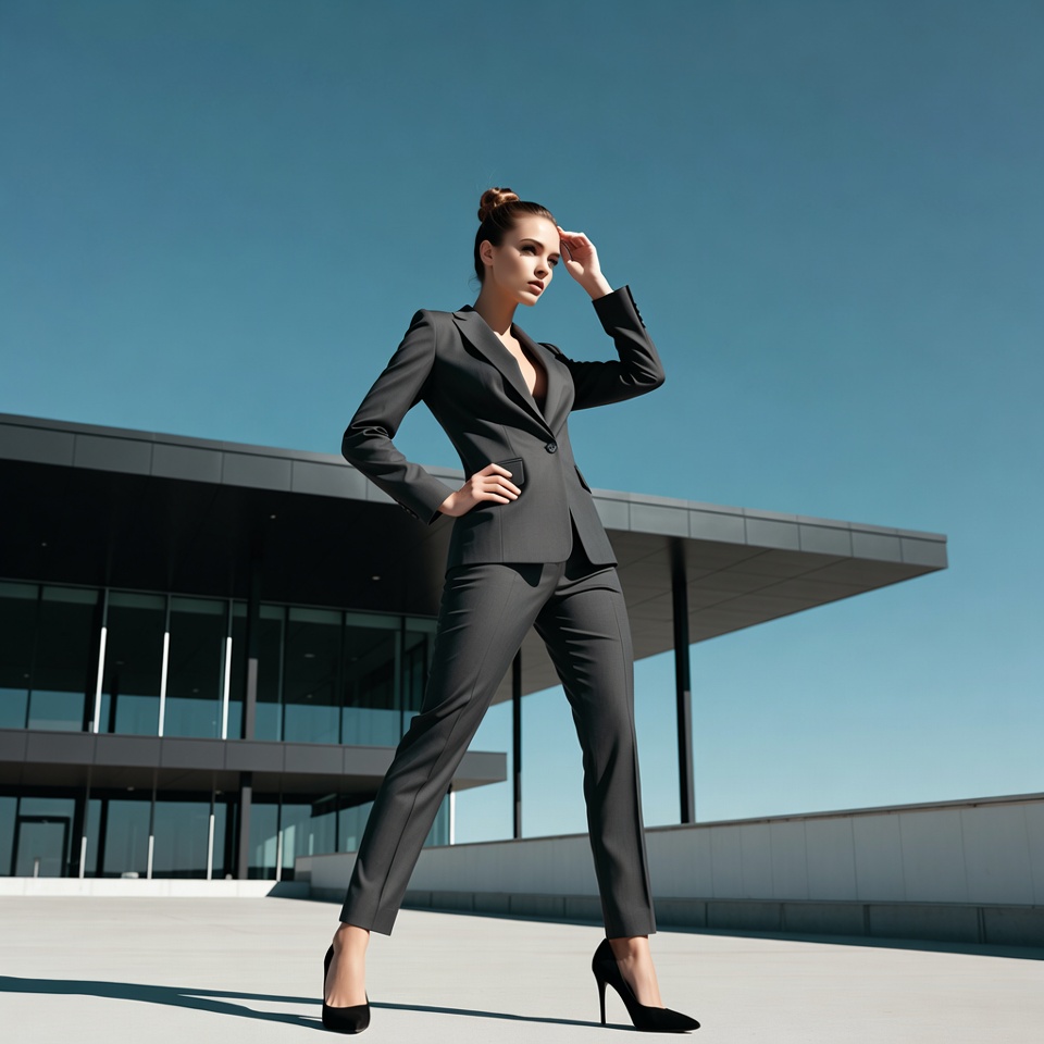 White, blazer, blue sky, bun hairstyle, businesswoman, confident pose, contemporary building, fashion model pose, female, glass facade, gray suit, hand on hip, high heels, modern building, office wear, pantsuit, power pose, professional attire, rooftop, shading eyes, stylish woman, urban architecture, woman