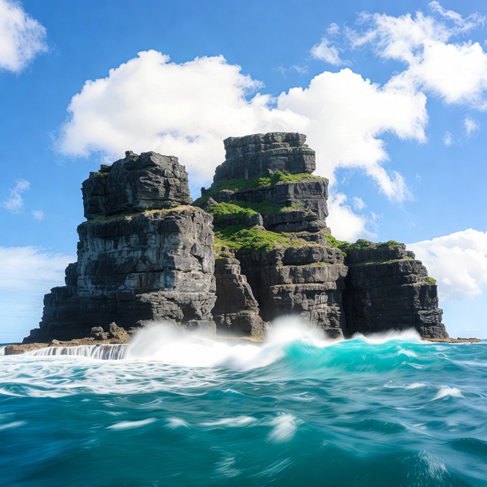 Towering dark rock stacks rise dramatically from the turquoise ocean, topped with patches of green grass. White-capped waves crash forcefully against the rugged base of the cliffs. A bright blue sky with scattered white clouds frames the scene.