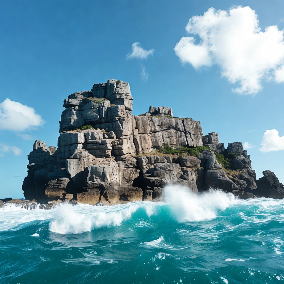 A tall, rugged rock formation rises dramatically from the turquoise ocean waters. White waves crash against its base under a clear blue sky with scattered white clouds. Sparse green vegetation clings to the jagged cliffs of the stack.