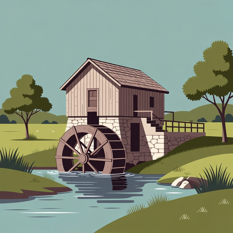 A flat illustration depicts a wooden watermill with a large water wheel beside a flowing river. The structure features stone base, wooden walls, shingled roof, and stairs with railing. Lush green trees, grass, and distant hills surround it on a light blue background.