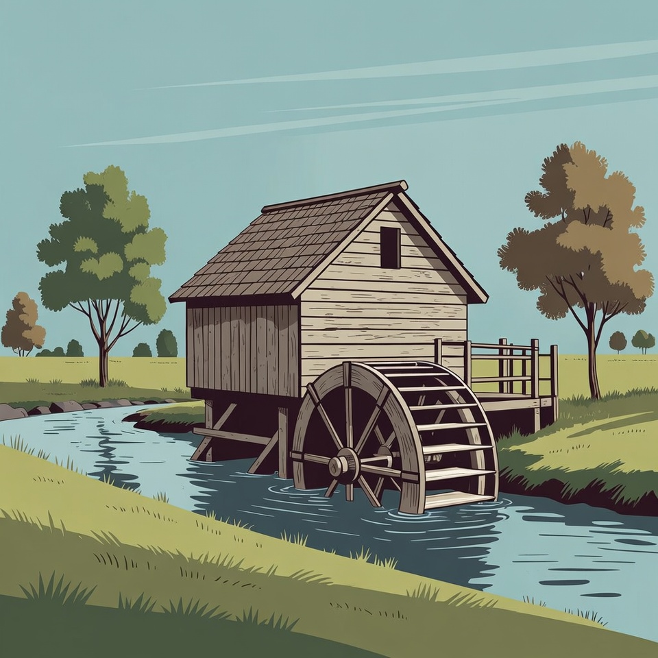 An illustration depicts a wooden watermill elevated on stilts over a flowing river. A large water wheel is attached to the side of the mill, surrounded by green grass and autumn trees. The scene features a clear sky and rocky riverbanks.