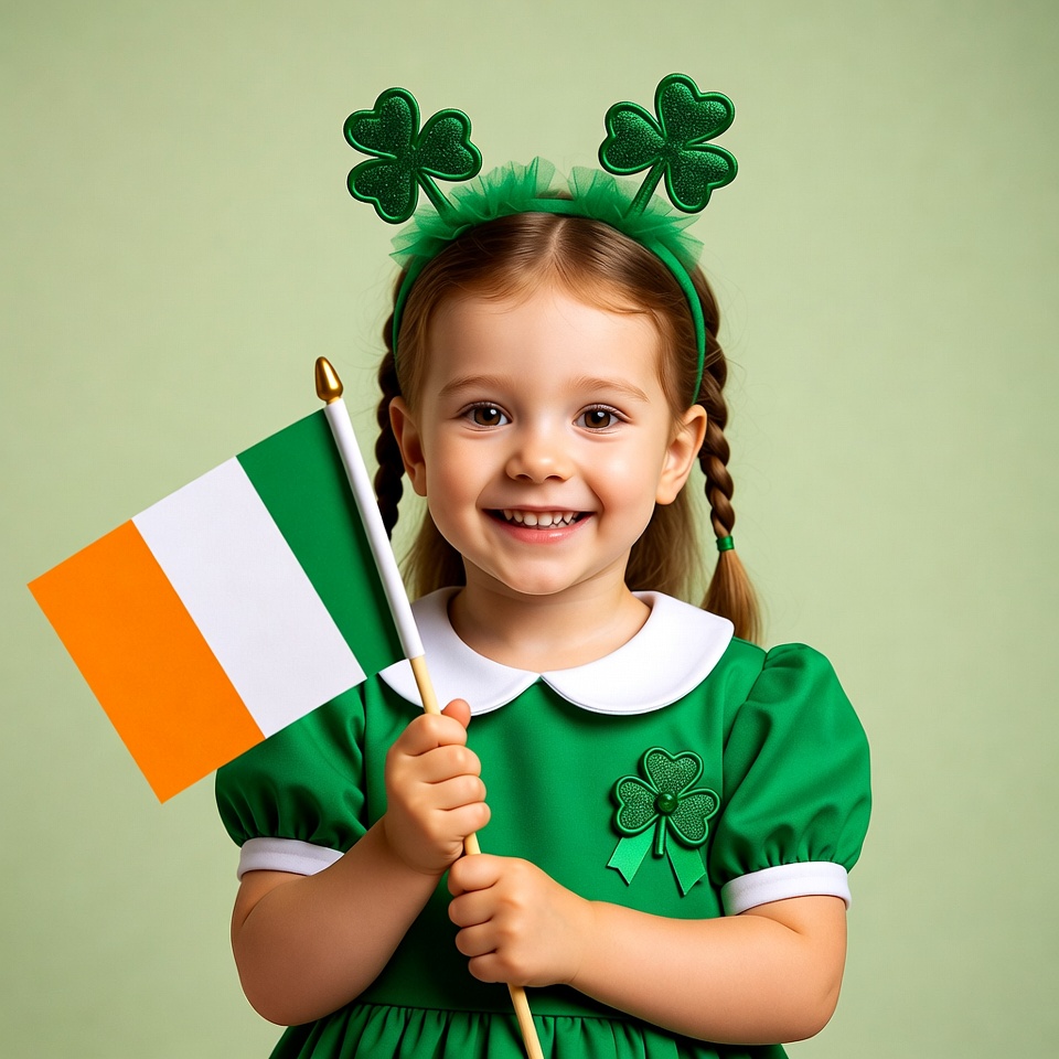 A young White girl with red hair in braids wears a green dress with shamrock accents and a shamrock headband. She smiles happily while holding an Irish flag on a green background. Her dress features white collar and embroidered shamrocks.