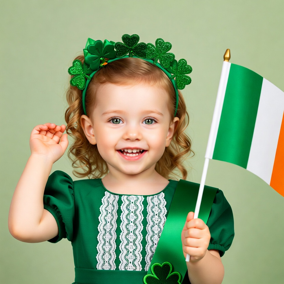 A young White girl with curly blonde hair smiles happily while holding an Irish flag. She wears a green dress with lace details and a green sash, topped with a headband of green shamrocks. She stands against a solid green background, raising one hand in a wave.