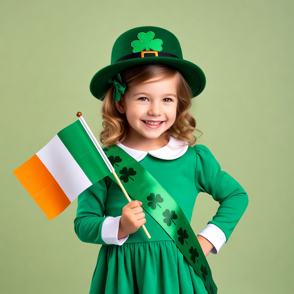 A young girl with curly blonde hair smiles while wearing a green shamrock top hat and a green dress with shamrock sash. She holds an Irish flag in her hand and stands confidently against a solid green background. Her outfit features white collar details and a large green bow.