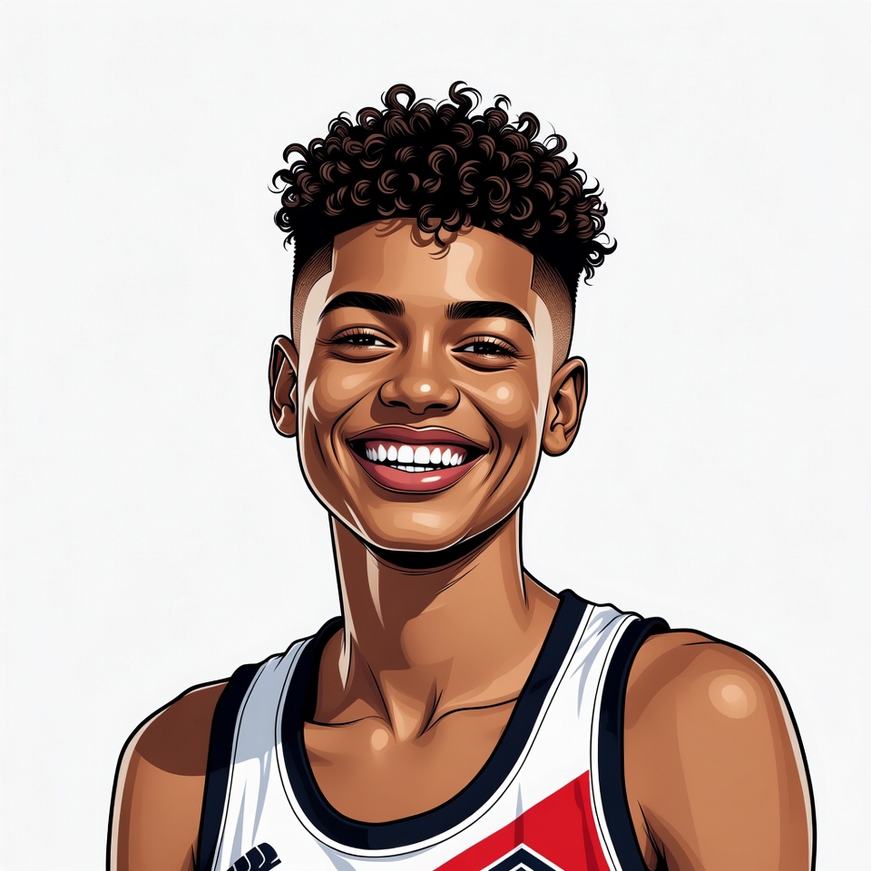 A young African-American man with curly hair smiles broadly at the viewer. He wears a white and red sleeveless basketball jersey with bold graphics. The illustration features him against an isolated white background.