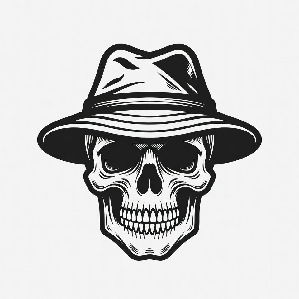 Halloween, black and white, clipart, death symbol, fedora hat, graphic design, grim reaper, illustration, isolated background, line art, noir style, pirate skull, skeleton head, vector art, skull