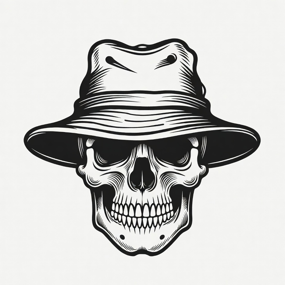 A black line art illustration of a grinning human skull wearing a wide-brimmed bucket hat. The skull has deep eye sockets and detailed shading in ink style. It is centered on a plain white background.