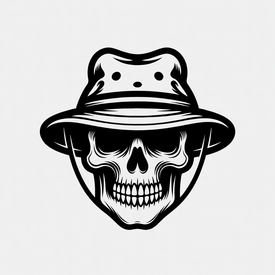 adventure skull, black white, clipart, dark eyes, explorer hat, graphic design, grinning skull, human skull, illustration, isolated background, line art, pirate hat, tattoo design, vector art, ventilation holes, wide brim hat, skull
