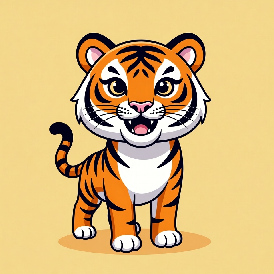 A cute cartoon tiger with orange fur and black stripes stands on a light yellow background. It has big expressive eyes, a wide smiling mouth showing teeth, and a playful expression. The illustration features white accents on the belly, paws, and muzzle, with a black-tipped tail.