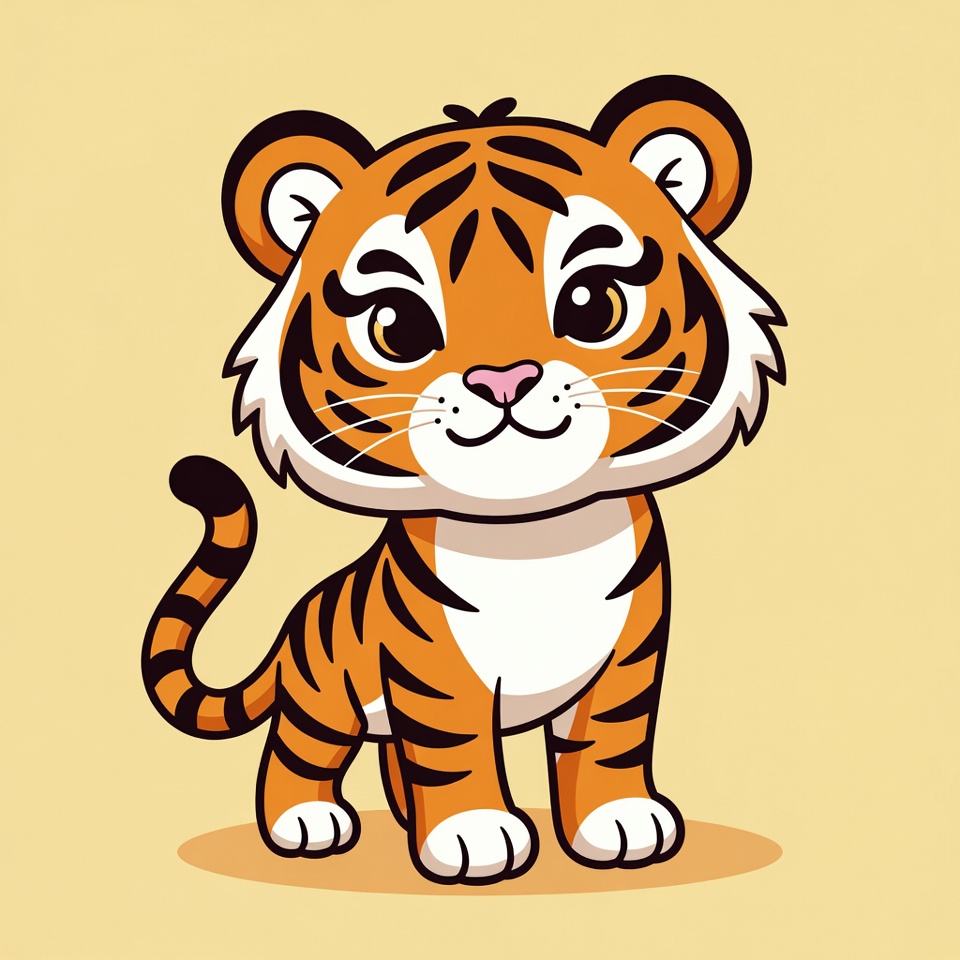 adorable tiger, animal illustration, baby tiger, big eyes, black stripes, cartoon tiger, chibi tiger, clipart tiger, cute tiger, furry animal, isolated background, kawaii tiger, orange tiger, playful cub, smiling tiger, standing tiger, tiger illustration, tiger mascot, vector tiger, tiger cub
