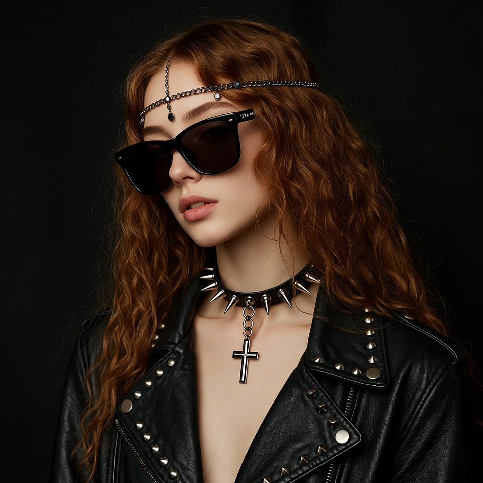 A young woman with long wavy red hair wears large black sunglasses and a beaded headpiece. She has a spiked black choker with a cross pendant around her neck and poses in a black studded leather jacket. The image is set against a dark background.
