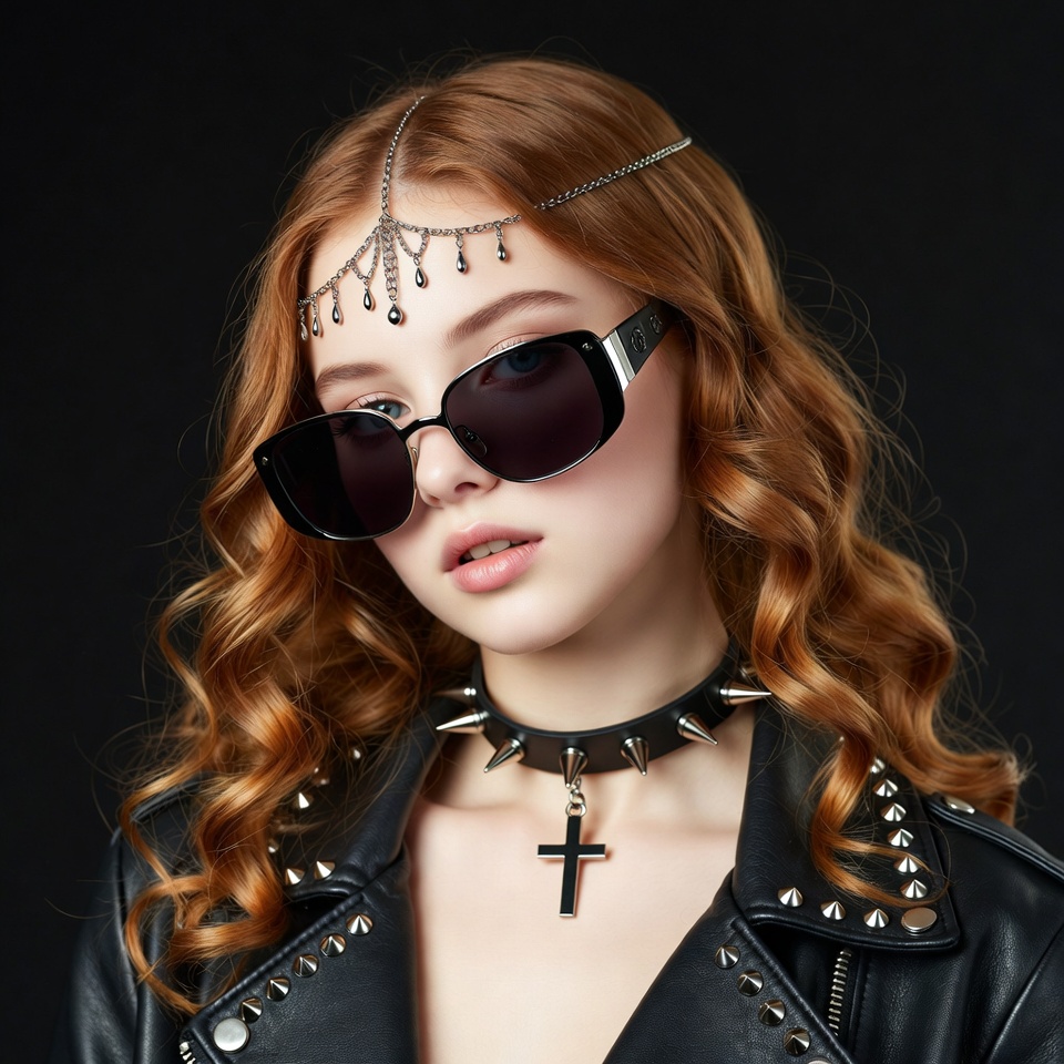 A young woman with long curly red hair wears oversized black sunglasses and a silver chain headpiece with dangling charms. She has a spiky black choker necklace featuring a silver cross pendant and poses in a black studded leather jacket. Her expression is subtle with slightly parted lips against a dark background.