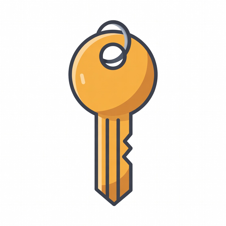 A simple orange key with a silver keyring is depicted in a flat illustration style. The key features a rounded bow and a jagged blade, centered on a white background. It has subtle shading for a 3D effect.