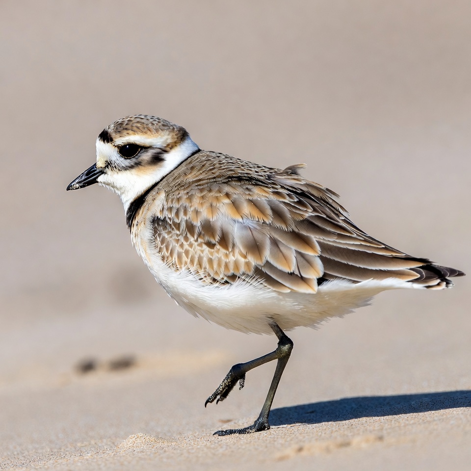 beach sand, bird legs, birdwatching, black eye band, brown feathers, feathers, isolated background, nature, plover bird, sand background, sea bird, shadow, shorebird, small bird, walking bird, white belly, wildlife, piping plover