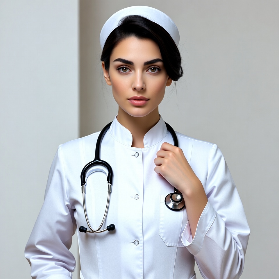 Middle Eastern, bun hairstyle, confident, dark hair, female, healthcare, isolated background, medical, nurse cap, nurse uniform, portrait, professional, standing, stethoscope, white coat, woman, nurse