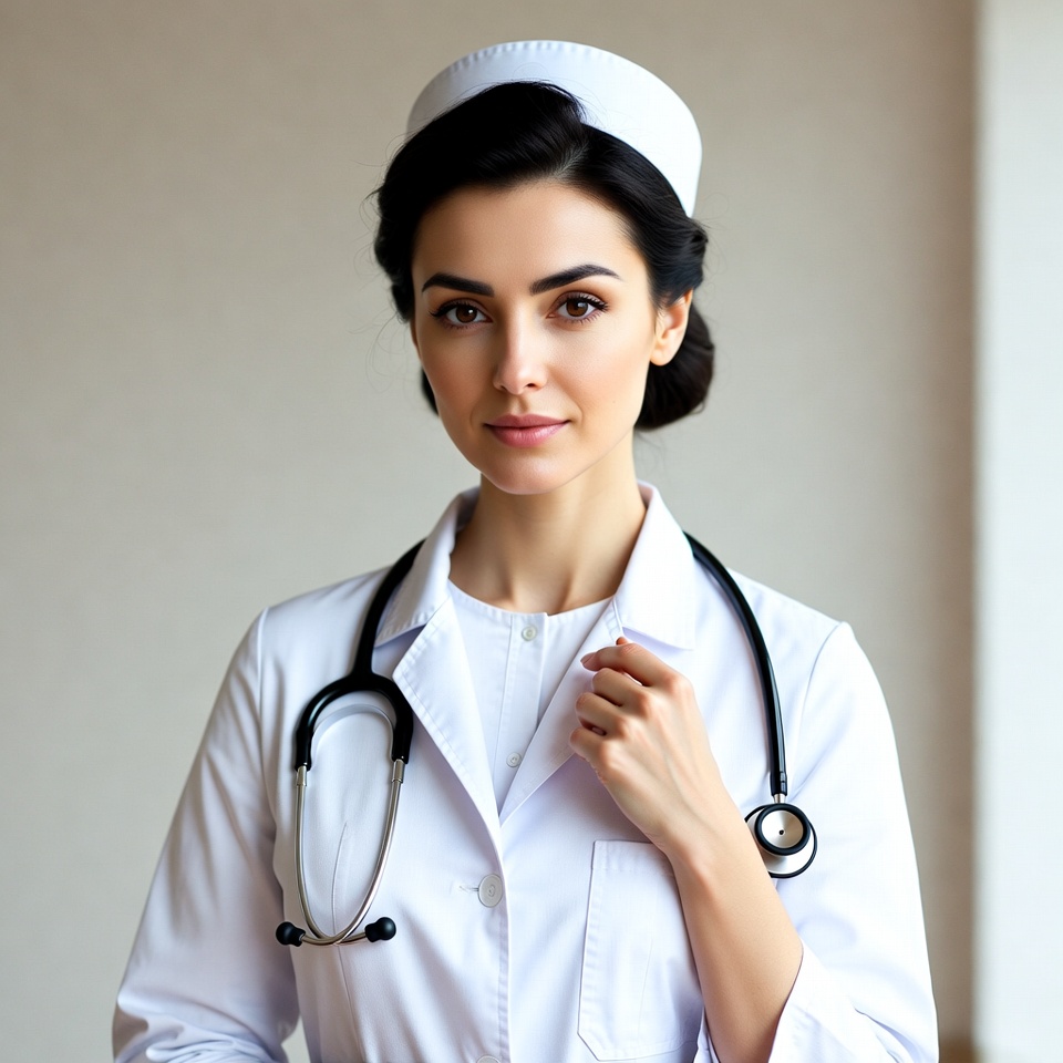 White, dark hair, female, healthcare, hospital worker, isolated background, lab coat, medical, medical uniform, nurse cap, nurse outfit, portrait, professional, smiling, stethoscope, updo, white uniform, woman, young woman, nurse