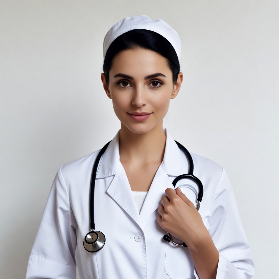 dark hair, doctor coat, female, health professional, healthcare, hospital worker, isolated background, medical, nurse cap, nurse uniform, portrait, professional, smiling, stethoscope, white scrubs, woman, young woman, nurse