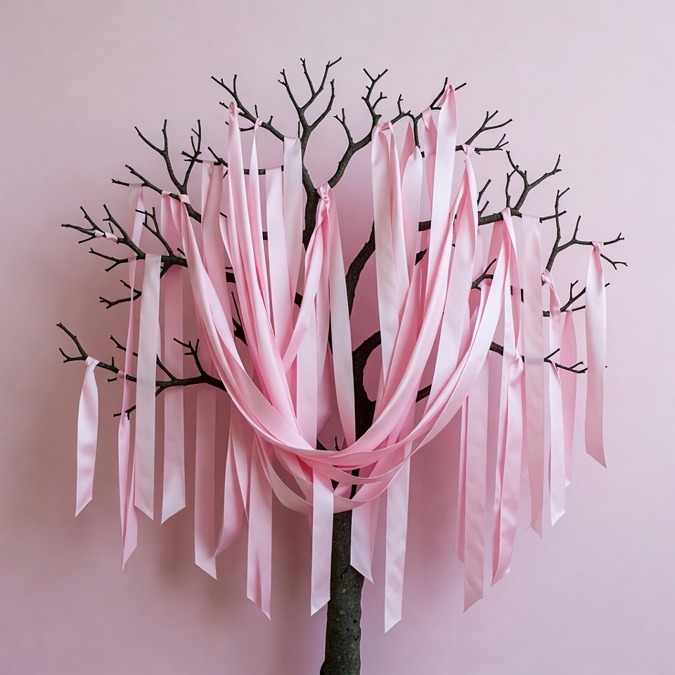 A bare black tree branch structure is decorated with numerous long pink ribbons hanging and draped from its limbs. The tree stands against a solid light pink background. The ribbons create a flowing, elegant cascade effect.