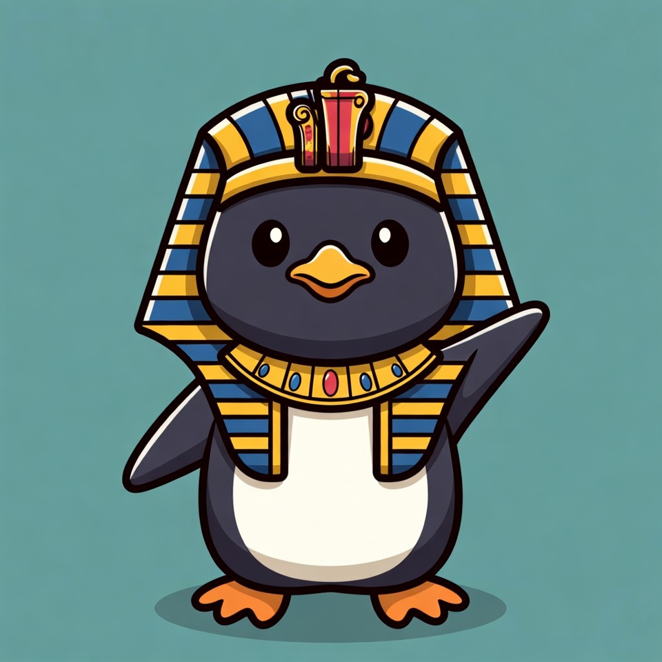 A cute cartoon penguin dressed as an Egyptian pharaoh waves with one flipper. It wears a golden headdress with red accents and striped collar. The illustration features big eyes and stands on a teal background.