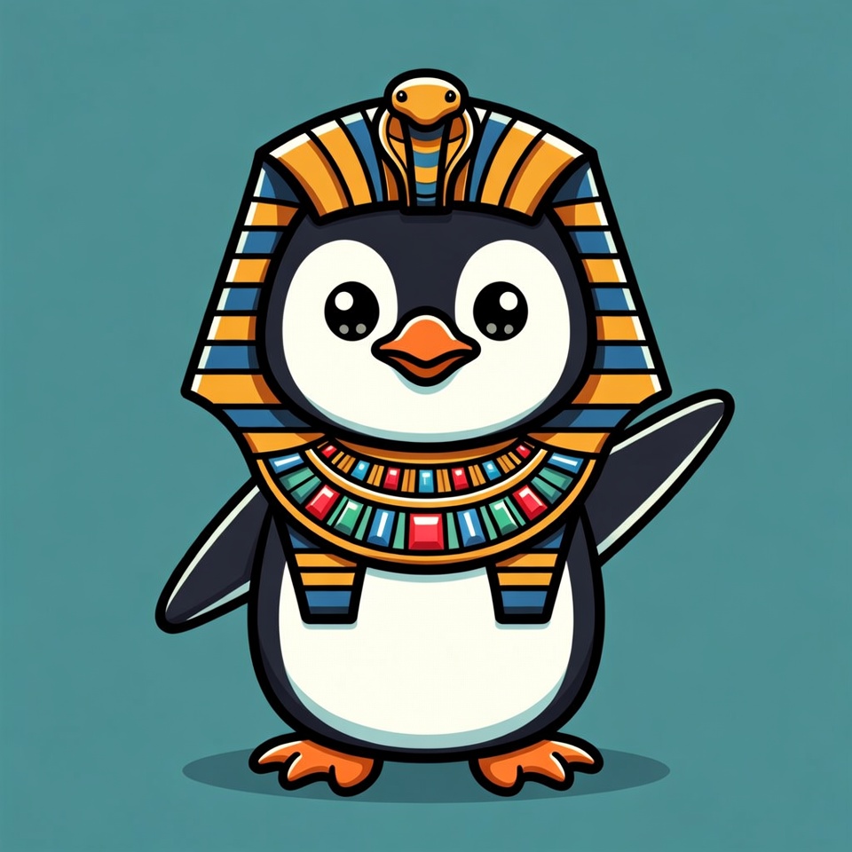 A cute cartoon penguin dressed as an Egyptian pharaoh stands on a teal background. It wears a tall blue and gold headdress with a cobra, colorful beaded necklace, and raises one flipper in a wave. The illustration features big sparkling eyes and a cheerful expression.