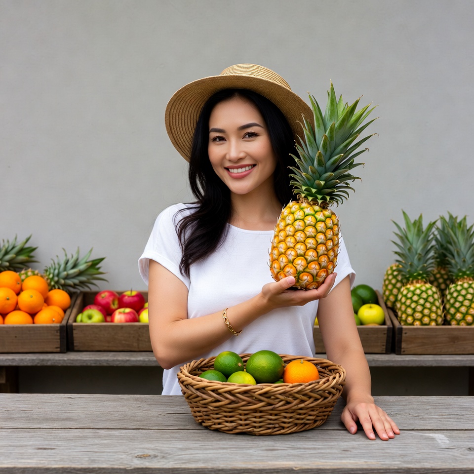 A smiling Asian woman with long dark hair and wearing a white shirt and straw hat holds a large pineapple in front of a market stall. She stands beside a wooden table with a woven basket containing limes, oranges, and lemons. The background features crates of pineapples, oranges, and apples on a gray wall.