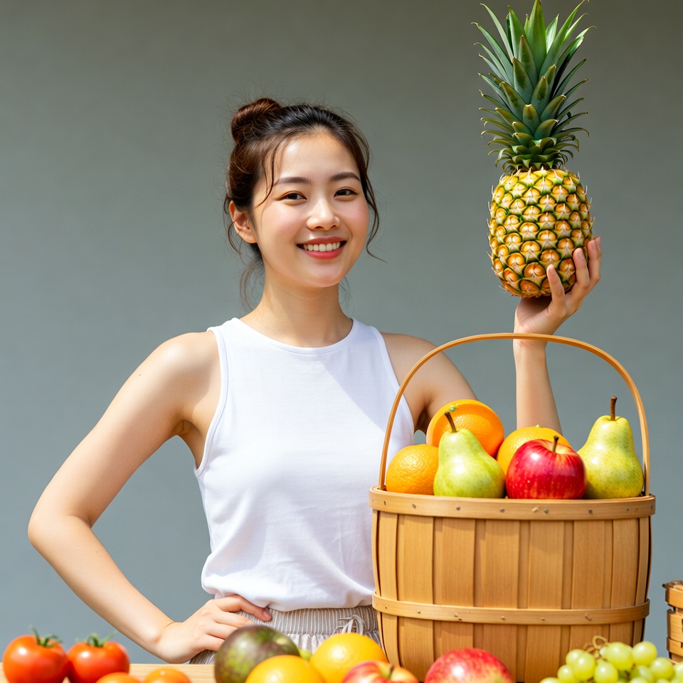 A smiling Asian woman with hair in a bun holds a fresh pineapple above a basket of oranges, pears, and apples. She wears a white tank top and beige shorts, standing in front of a gray background with additional fruits like tomatoes and grapes scattered around. The image highlights vibrant fresh produce and the woman's joyful expression.