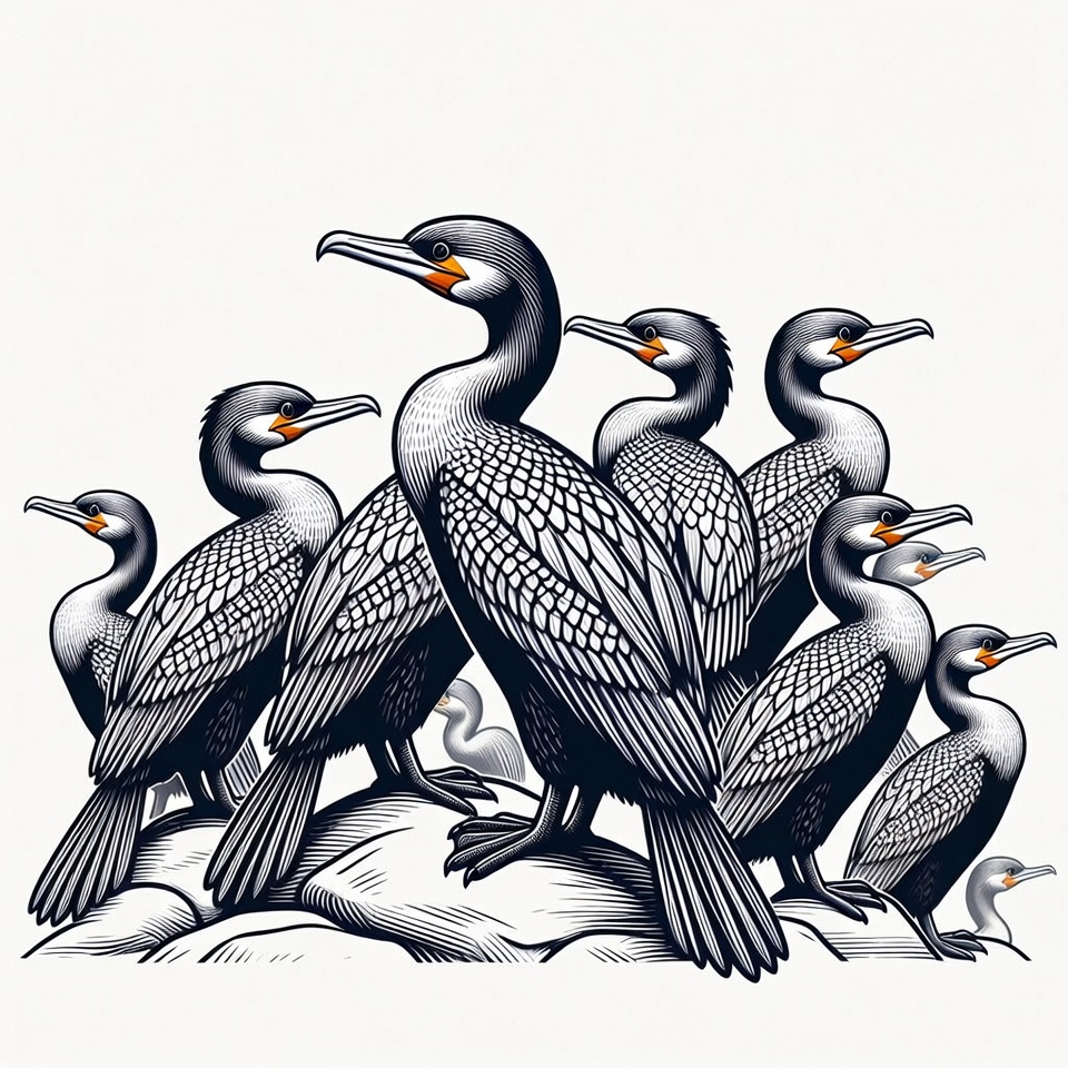 A detailed black and white illustration features multiple cormorants perched closely together on white rocks. The birds display sleek feathers, long necks, sharp orange beaks, and intense eyes. The artwork uses intricate line work and shading for a realistic effect against an isolated background.