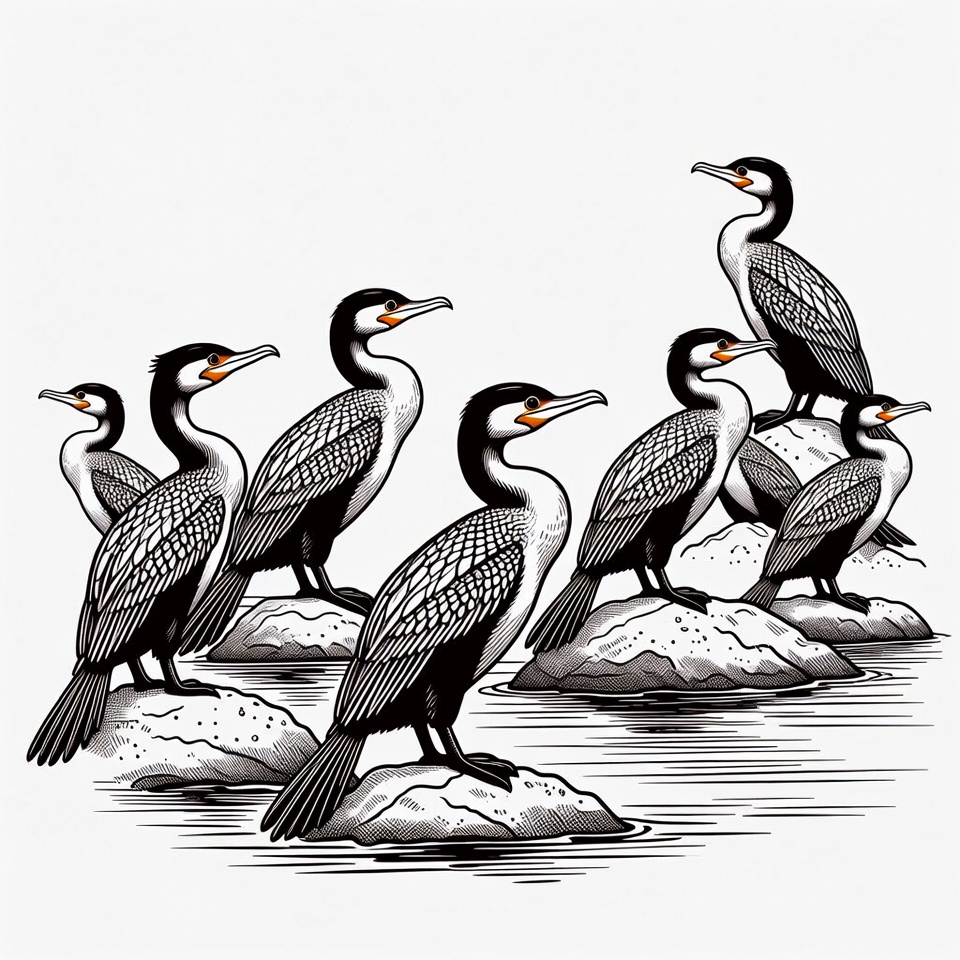 An illustration features several black and white cormorants standing on gray rocks emerging from shallow water. The birds have long necks, orange facial skin, and detailed feather patterns. They are depicted in various poses against a plain white background.