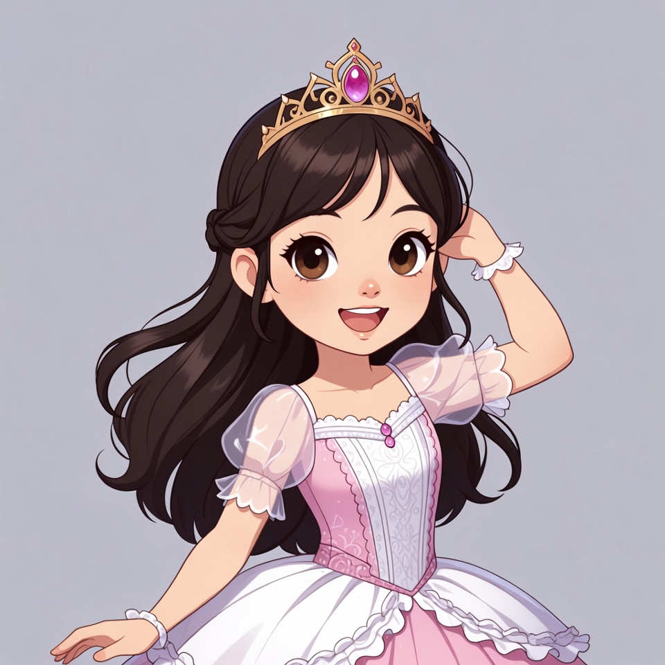 A cute anime girl with long brown hair and large expressive eyes wears a golden crown with a pink gem. She has a joyful smile, one hand raised to her head, and the other extended outward. She is dressed in a pink and white frilly princess gown with sheer puffed sleeves on a plain gray background.