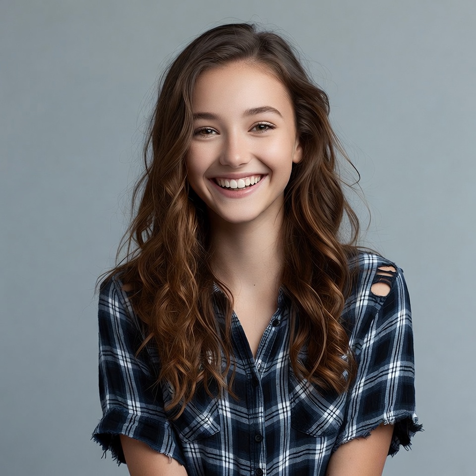 A young girl with long wavy brown hair smiles warmly at the camera. She wears a torn plaid shirt in blue and black tones. The image features a plain gray background.