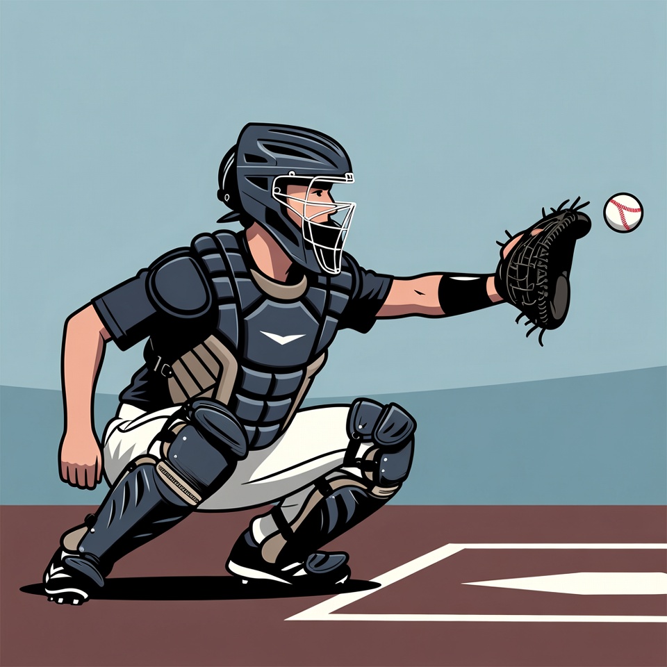 A male baseball catcher in full protective gear crouches behind home plate on a baseball field. He wears a dark catcher's mask, chest protector, and leg guards while extending his mitt to catch a baseball. The illustration features a simple blue sky and field background.