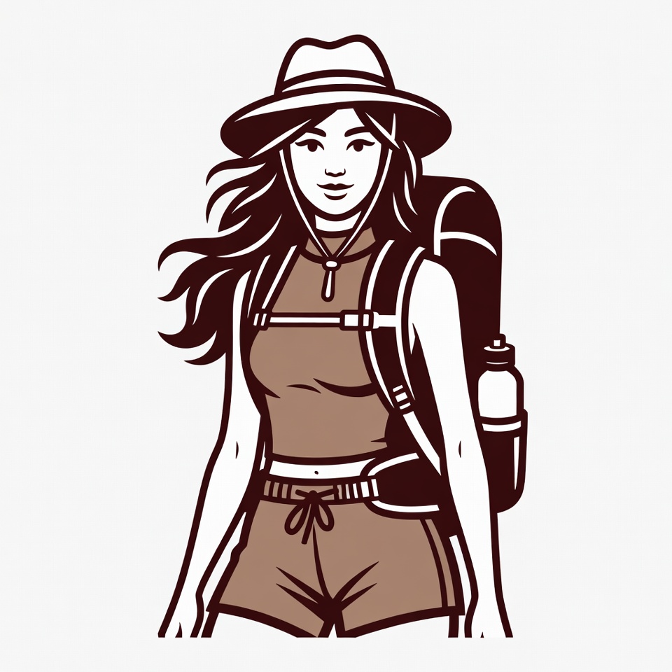 A line art illustration of an Asian woman wearing a wide-brimmed hat, a sleeveless top, shorts, and a large backpack with a water bottle. She has long flowing hair and stands confidently on an isolated white background. The design features bold outlines in brown tones.
