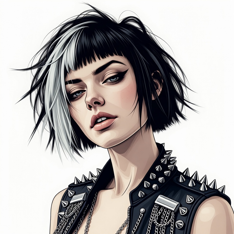 Digital illustration of a young woman with striking black and white bob haircut and heavy eyeliner. She wears a black studded leather vest with chains and has a sultry expression. The portrait is on a white isolated background.