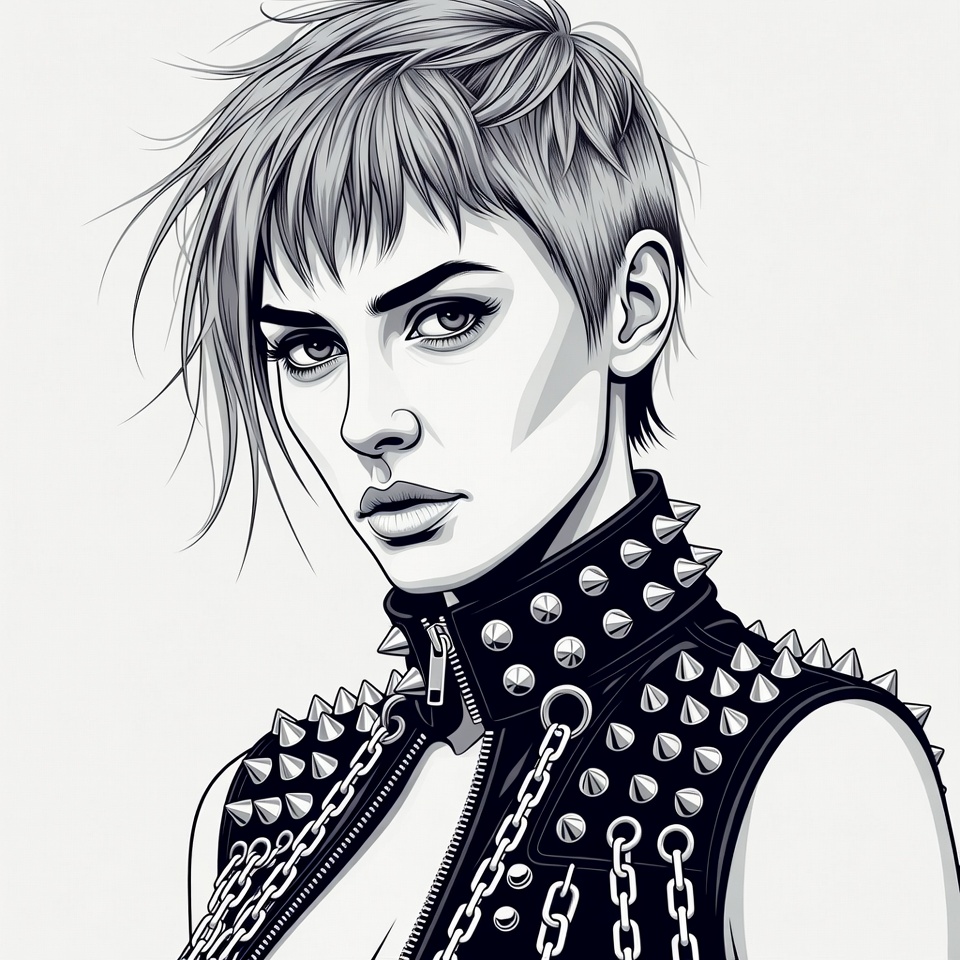 White, black and white, chains, edgy style, female, illustration, intense eyes, leather vest, line art, portrait, serious expression, short hair, spiked collar, studs, tousled hair, zipper, woman